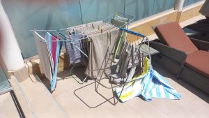 Pon los tendederos con toallas entre la mes y la ventana. no puede dejarlos en la terraza, donde hay viento.